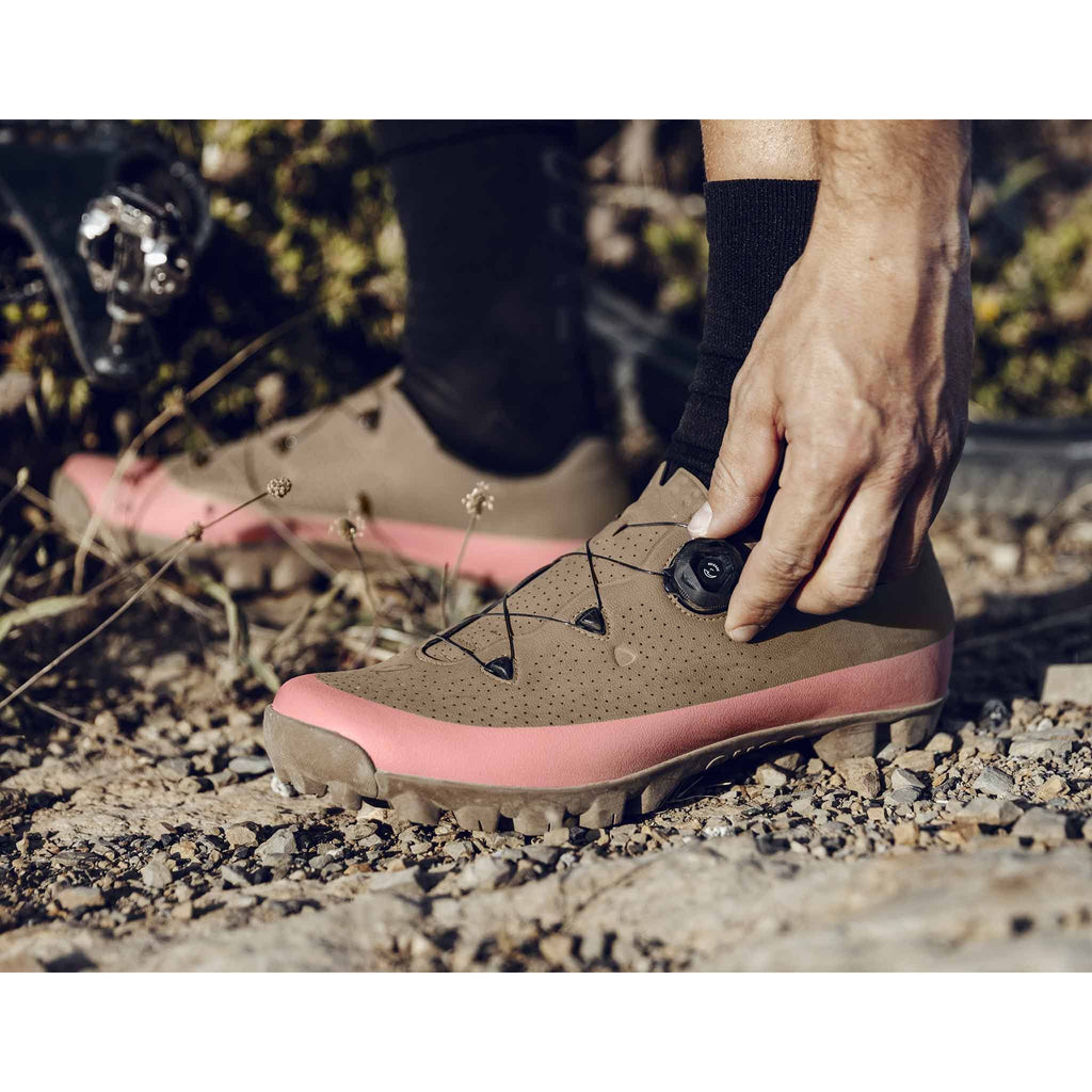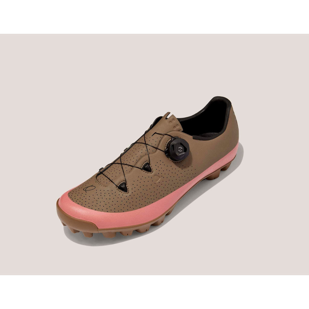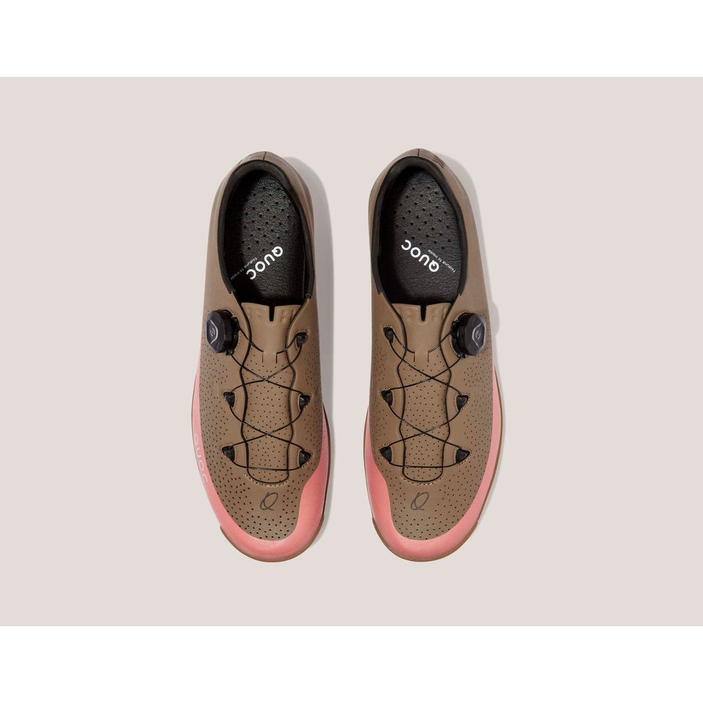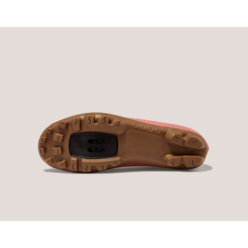 The QUOC GRAN TOURER II - PINK is a high-performance cycling shoe designed specifically for gravel cyclists. It features a supple, foot-hugging upper, vibration-absorbing insoles, and optimally padded lining for unbeatable comfort on and off the bike. The shoe also boasts an in-house developed dial system technology for micro-accurate precision adjustment, making it easy to get on and off in dynamic ride scenarios. The stiffer, Nylon-composite midsole provides excellent performance and race-readiness while remaining lightweight. The custom-specced GravelGrip™ rubber outsole offers superior grip and walkability, perfect for multi-day, ultra-distance races or leisurely hike-a-bike tours. The shoe also features quick-drying ankle padding for all-weather riding and a modern, understated aesthetic with pristine edge detailing and QUOC's signature color border.