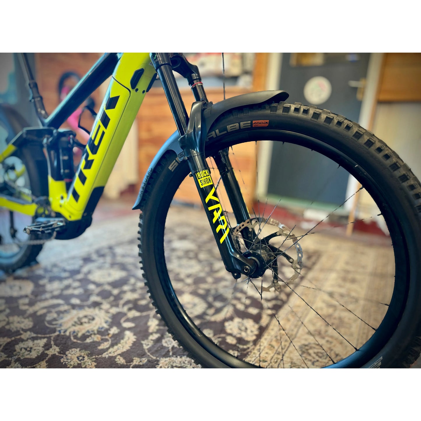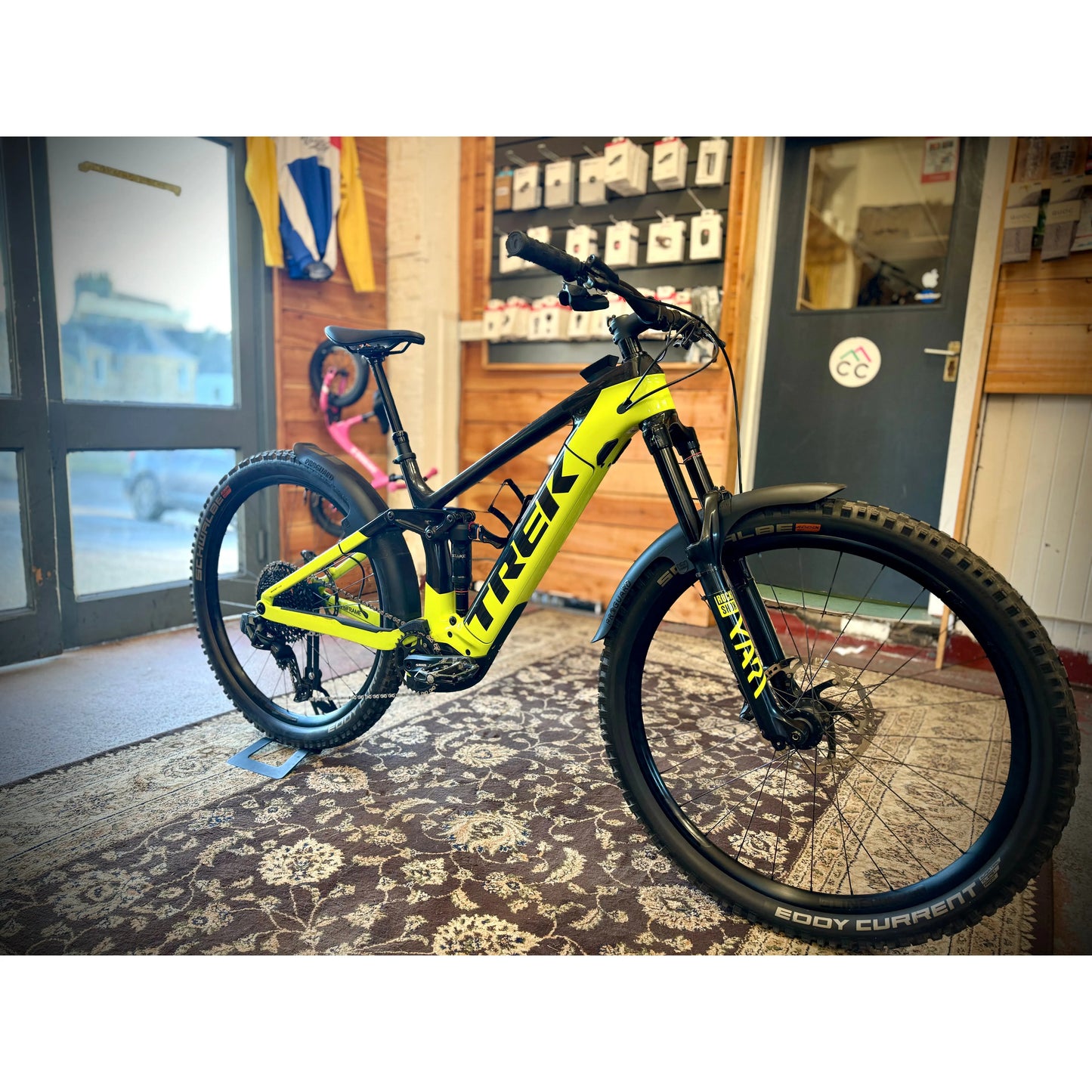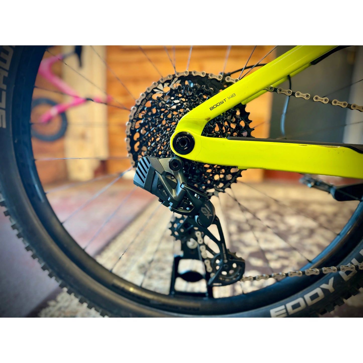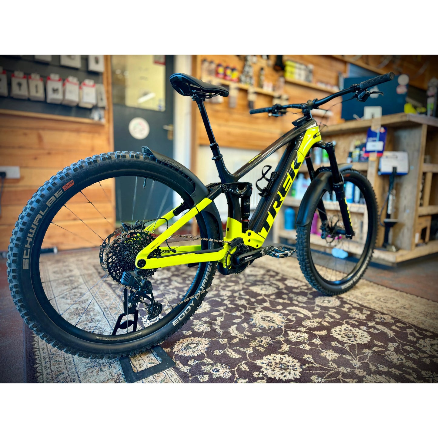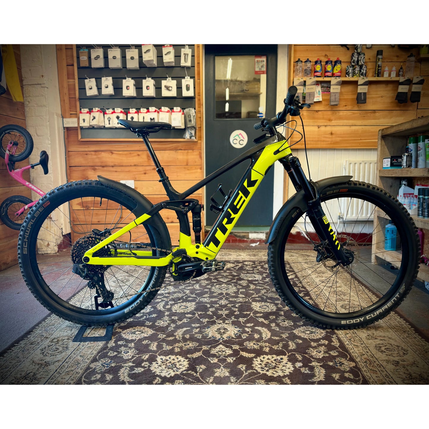 The bike has been upgraded to GX AXS and it has a set of Schwalbes on it too. The fork has had a charger fitted too.